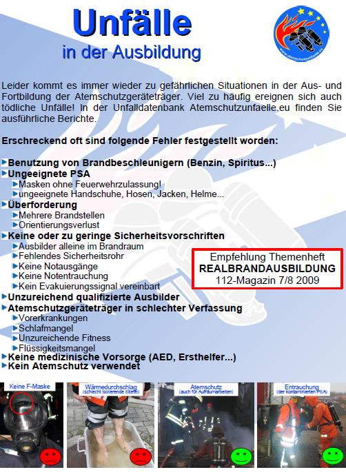 Atemschutzunfaelle.eu empfiehlt seit vielen Jahren eine Realbrandausbildung! Aber: BITTE OHNE BRANDBESCHLEUNIGER!. Die wichtigsten Hinweise, als Lehre aus missglückten Ausbildungsveranstaltungen, haben wir im Jahr 2010 für die Interschutz mit einem Plakat dargestellt. Weitere Informationen haben wir mit einem Themenheft Realbrandausbildung veröffentlicht (kostenloser Download). Wir bitten dringend um Beachtung der Hinweise, um weiteres Leid zu vermeiden.
